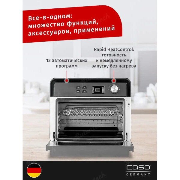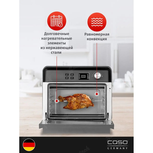 CASO AirFry Chef 1700 имеет три уровня для установки противня, а также вращающийся шампур для гриля и корзину для жарки.