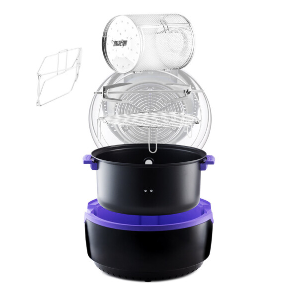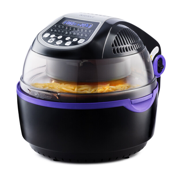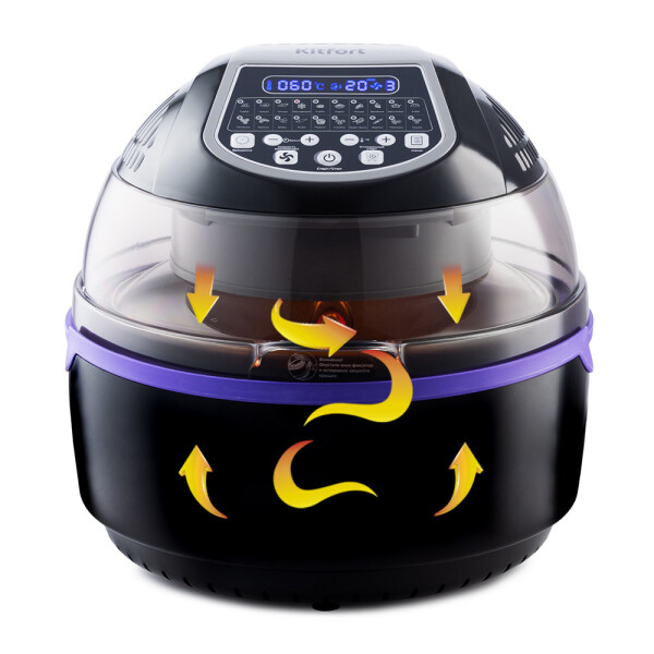 Вентилятор, расположенный в верхней части аэрогриля, обеспечивает циркуляцию горячего воздуха от нагревателя внутри рабочей ёмкости. Тем самым, продукты равномерно обжариваются со всех сторон, получаются нежными внутри и с хрустящей корочкой снаружи.