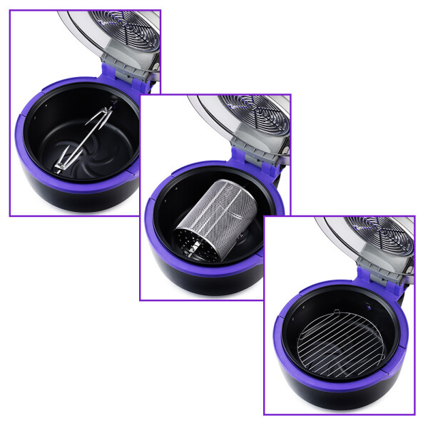 В комплекте к аэрогрилю идут вертел для приготовления курицы целиком, решётка, вращающаяся корзина. На решётке можно располагать продукты или термостойкие чаши и готовить в них. Вращающаяся корзина подходит для приготовления картошки-фри и других блюд.