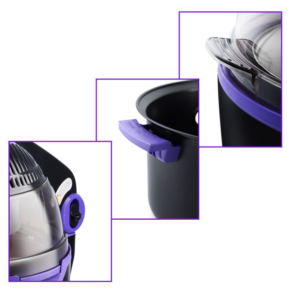 В центре ТЭНа находится галогеновая лампочка, которая подсвечивает продукты в чаше. Часть крышки сделана прозрачной, чтобы можно было наблюдать за процессом приготовления.
