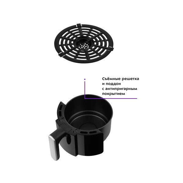 Съёмные решётка и корзина имеют антипригарное покрытие, благодаря чему они легко чистятся после использования, а блюда можно готовить практически без добавления масла.
