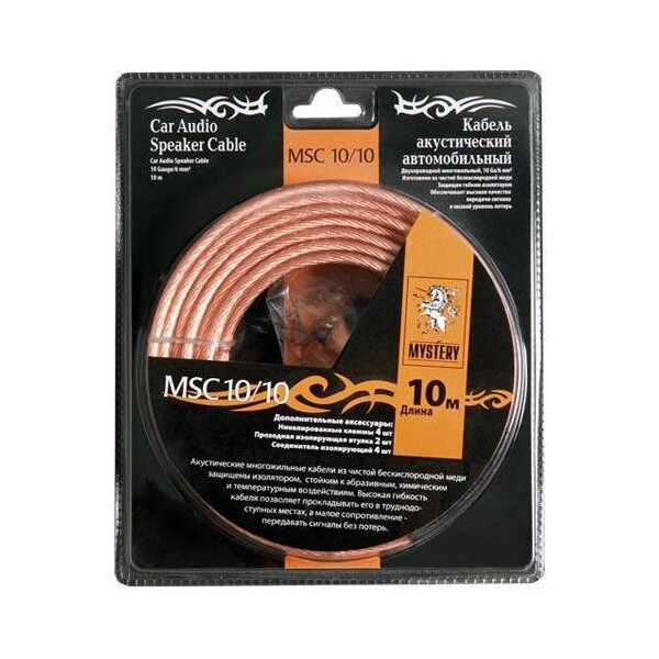 MYSTERY Двухпроводной многожильный акустический кабель 10 Ga/6 мм² , длина 10м. Максимальный уровень сигнала не более 8В. Акустические многожильные кабели из чистой бескислородной меди защищены изолятором, стойким к абразивным, химическим и температурным воздействиям. Высокая гибкость кабеля позволяет прокладывать его в труднодоступных местах, а малое сопротивление – передавать энергию без потерь.