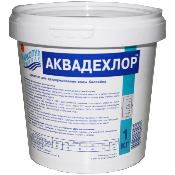 Средство для дехлорирования воды бассейна, понижает концентрацию остаточного хлора до предельно допустимого уровня. Состав: бесцветный кристаллический порошок, содержит натрия гипосульфит.