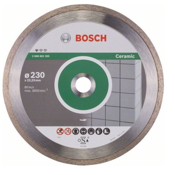 Диск алмазный отрезной Bosch 2.608.602.205 по керамической плитке, серия Professional ECO. Обеспечивает аккуратный рез керамической плитки без риска сколов. Отрезной край диска образуется спеканием.