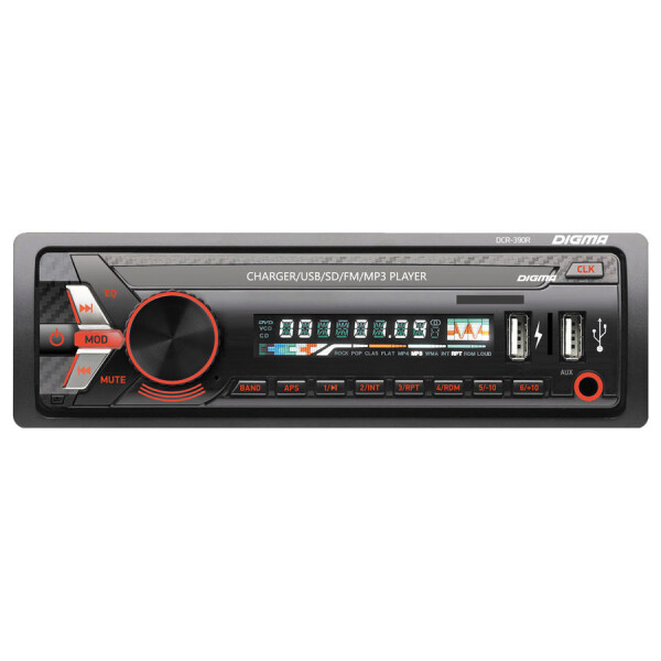 Автомагнитола DIGMA DCR-390R имеет удобное и понятное управление, позволяет слушать любой трек в дороге. Производится музыка с мощностью 4×45 Вт, чего достаточно для чистого и громкого звучания. Чтобы отрегулировать ее частоту, следует воспользоваться встроенным эквалайзером. Черный корпус автомагнитолы DIGMA DCR-390R во включенном состоянии загорается красным светом, благодаря чему все кнопки видны и в темноте. Устройство компактное и достигает типоразмера 1 din. Наиболее быстрый способ — включить на панели одну из 18 станций FM-тюнера. Также можно подключить любую технику с помощью USB-порта. Еще один вариант — скачать аудио на карту памяти формата SD и MMC и вставить ее в специальный разъем.