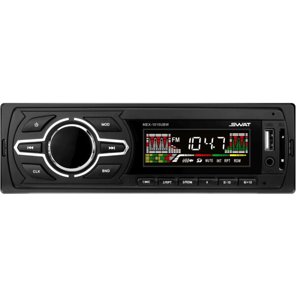 Swat MEX-1015UBW стильная небольшая магнитола. Вписывается в любой интерьер автомобиля. Белая подсветка кнопок даёт приятное свечение в ночное время суток. Стандартный типоразмер 1 din позволяет произвести лёгкую и не требующую профессионализма установку. Многоцветная подсветка дисплея разнообразит вид.