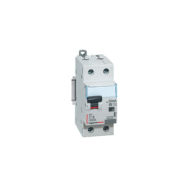 Автоматический выключатель, управляемый дифф. током со встроенной защитой от сверхтоков (АВДТ) серии DX3 типа AC (реагирует на утечку переменного (синусоидального) тока). Номинальный ток - 16А. Отключающая способность - 6кА. Номинальный отключающий дифф.ток - 30мА (для защиты линий и групп устройств). Размер - 2 модуля DIN (35 мм).
