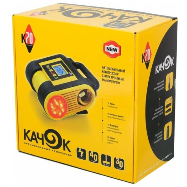 Автомобильный портативный компрессор Качок К70 - простой в эксплуатации прибор, который благодаря небольшим размерам и малому весу удобно возить с собой в багажнике автомобиля. Данная модель работает не более 30 минут в непрерывном режиме. Корпус компрессора оснащен рукояткой для комфортной переноски. Многофункциональный ЖК дисплей обеспечивает удобство визуального контроля работы устройства.
