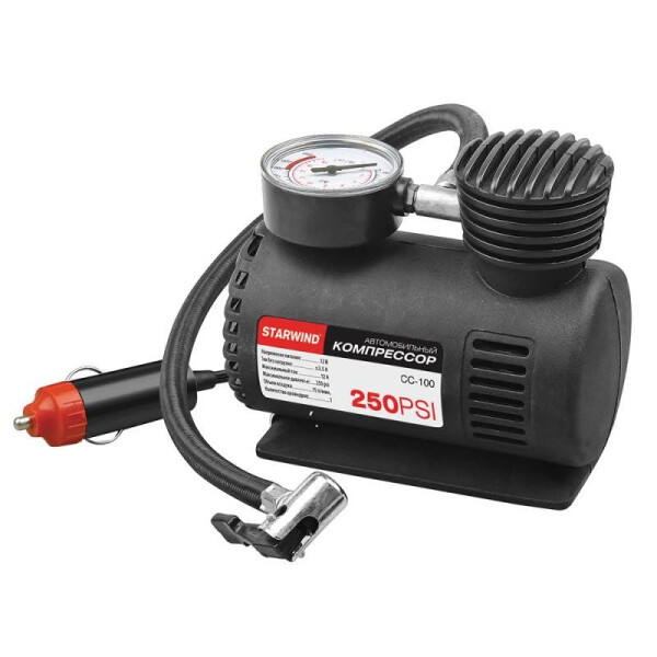 Компрессор для шин Starwind CC-100 – то, что нужно в дальней дороге, и то, что должен иметь под рукой уважающий себя автолюбитель. Ведь это прибор с высокоточным манометром, который может пригодиться в любой момент. С ним вы в кратчайшие сроки сможете накачать шины своего легкого авто, а также резиновые надувные изделия типа мячей и матрасов. 15 л/мин – такова скорость накачивания устройства, 17 АТ – максимальное давление. Питается Starwind CC-100 от прикуривателя, длина его кабеля питания составляет 3 м, такой шланг не треснет даже при сильных морозах.