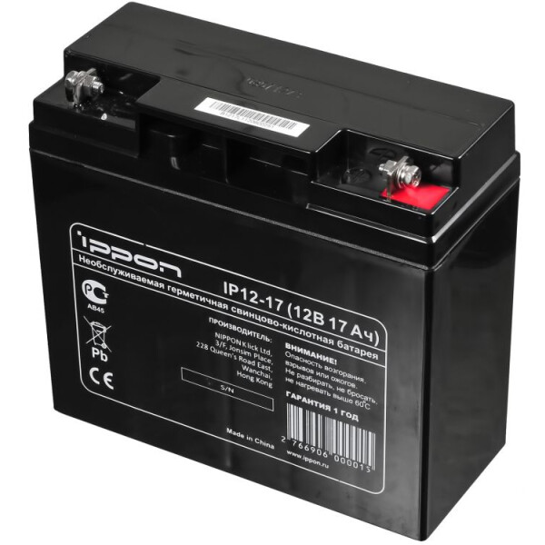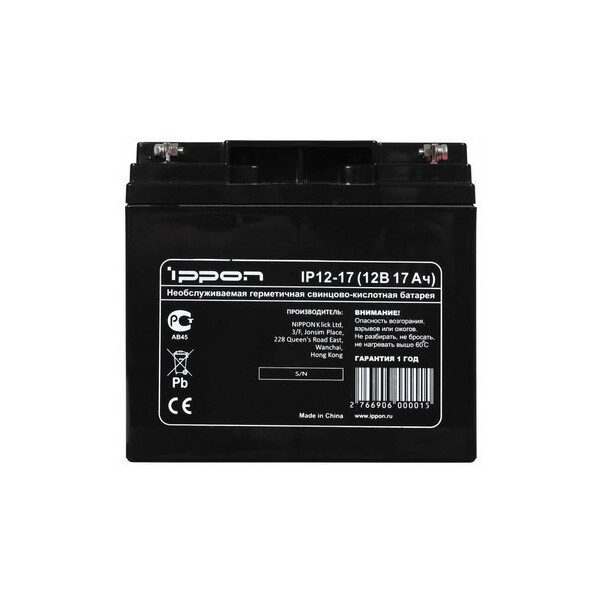 Батарея для ИБП Ippon IP12-17 для обеспечение резервного питания телекоммуникационного, охранного и другого типа оборудования. Для подсоединения питания используются клеммы F2 с размерами 14 мм на 13 мм. Максимальный ток разрядки аккумулятора составляет 270 А за время 5 секунд. Оптимальная рабочая температура колеблется в пределах 25 градусов Цельсия. Батарея для ИБП Ippon IP12-17 обладает массой в 5.55 кг и размерами корпуса в 181 мм длиной, 77 мм шириной и 167.5 мм высотой. Благодаря умеренным габаритам аккумулятор легко транспортируется, а корпус, выполненный из термопластического листового конструкционного материала, позволит не волноваться за его сохранность. Удобная в эксплуатации и обеспечивающая длительное время работы источников питания компании IPPON, батарея обладает номинальным напряжением в 12 В и емкостью 17 Ач.