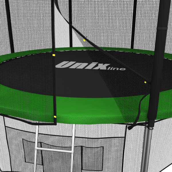 Помимо верхней защитной сетки, все батуты модельного ряда UNIX line оборудованы нижней защитной сеткой, которая препятствует проникновению под прыжковое полотно батута детей, животных, а так же попаданию посторонних предметов, и лестницей для удобства пользования.