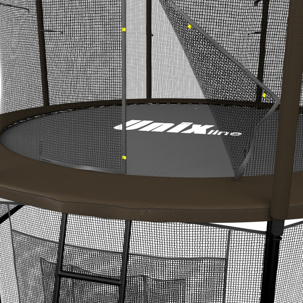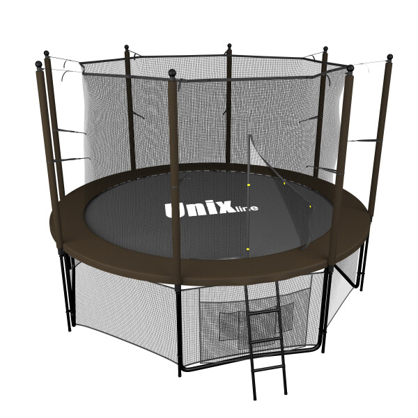 Батуты UNIX line™ серии Black&Brown разработаны для ежедневного использования детьми и взрослыми, устойчивы к неблагоприятным погодным условиям и соответствуют международным стандартам качества ISO 9001. Данную серию батутов отличает двойная порошковая окраска опор батута, улучшенная система креплений стоек защитной сети батута STRONG FIX, а также благородное сочетание глубокого коричневого цвета защитного мата и стоек батута с матовым черным цветом опор. Благодаря такому цветовому решению, спортивный снаряд гармонично впишется в ландшафт загородного участка. Металлический каркас батутов UNIX line™ выполнен из особо прочной гальванизированной стали с использованием новейшей системы креплений деталей рамы батута «T-Conneсtor» (толщина стали 2.2 мм), что обеспечивает высокую надежность рамы и уровень безопасности пользователя, максимально допустимый вес которого, в зависимости от модели (размера), может достигать 160 кг. Прыжковое полотно батутов UNIX line™ обладает повышенной износостойкостью благодаря высокой плотности волокон полипропилена (перматрон), из которых состоит само полотно. Защитный мат для пружин, расположенный по периметру батута, состоит из четырех слоев, обшитых ПВХ материалом, плотностью 150 г/см3 и надежно закрывает пружины. Помимо верхней защитной сетки, все батуты модельного ряда UNIX line™ оборудованы нижней защитной сеткой, которая препятствует проникновению под прыжковое полотно батута детей, животных, а также попаданию посторонних предметов, и лестницей для удобства пользования.