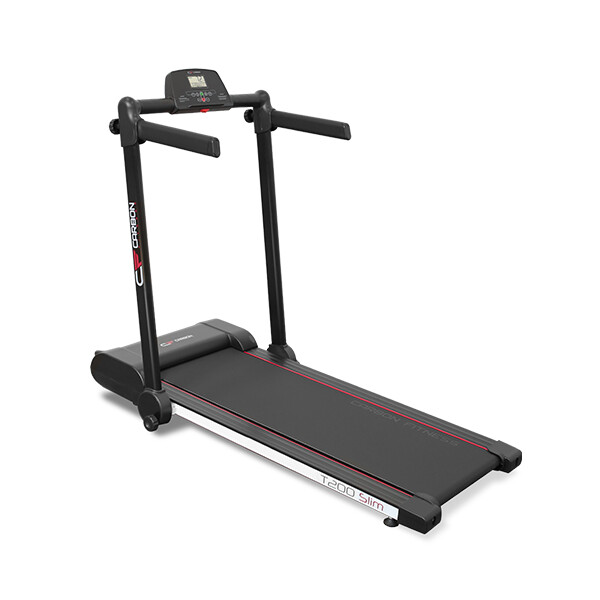CARBON FITNESS T200 SLIM – отличное решение для любителей заниматься бегом в домашних условиях. Беговая дорожка имеет уникальную систему складывания. В сложенном виде толщина тренажера составляет всего 15 см. Это позволит хранить дорожку под кроватью или на балконе. На тренажере расположены специальные опоры с рельефным покрытием и подставка, которые обеспечивают его устойчивость. За перемещение беговой дорожки отвечают 2 транспортировочных ролика.
