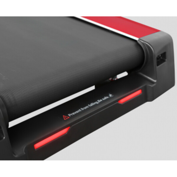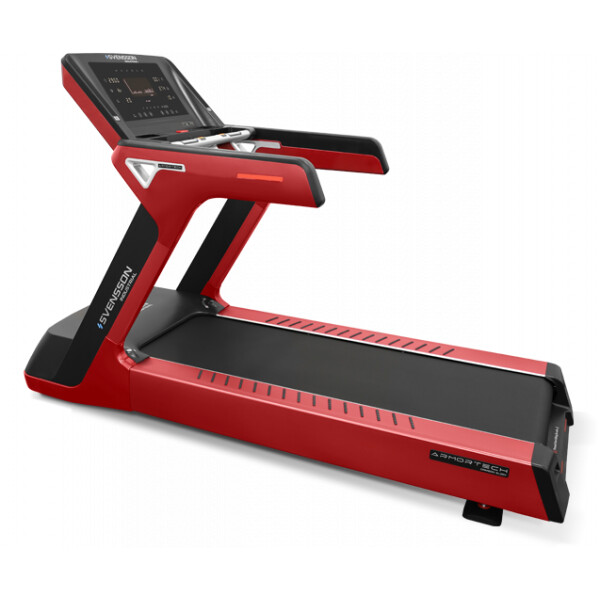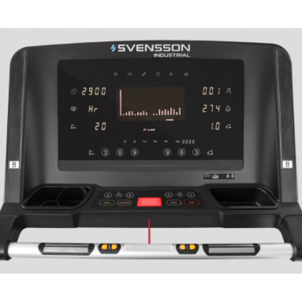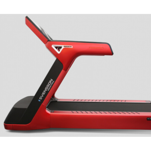 Беговая дорожка Svensson Industrial Armortech (Crimson Glory) выполнена в стиле индустриального хайтека, на стыке лаконичных выверенных линий в сочетании с футуристическими элементами из мира робототехники. Усиливают общее впечатление "ходовые огни", расположенные по бокам и сзади беговой дорожки. Они не только создают дополнительный визуальный эффект, но и несут вполне практическую составляющую - яркая красная подсветка показывает, что дорожка находится в движении. Масса вещей скрывается в различных, невидимых глазу мелочах. Кожух моторного отсека закреплён не саморезами или винтами, как это происходит обычно, а двумя клипсами, которые можно открыть за пару секунд. Это сильно облегчает процесс доступа к моторному отсеку для его очистки. Даже если у вас нет пылесоса - в специальной нише предусмотрена кисточка. Здесь же находится масленка с силиконом для смазывания полотна. Само смазывание происходит автоматически, никаких специальных процедур с проливом деки силиконом не требуется. Единственное, что необходимо - периодически добавлять силикон в систему автоматического смазывания. Тренировочный компьютер представлен основным LED дисплеем и 6 дополнительными LCD дисплеями. Все важные функции вызываются через сенсорные кнопки, расположенные на основном дисплее. 24 встроенные программы ориентированы на любые возможные задачи - снижение веса, тренировку выносливости или скоростных качеств. Рама беговой дорожки выполнена из сверхпрочного тяжелого профиля. Достаточно сказать, что нетто вес тренажера составляет 265 кг. Режим эксплуатации предполагает любую нагрузку, вплоть до 24х7.
