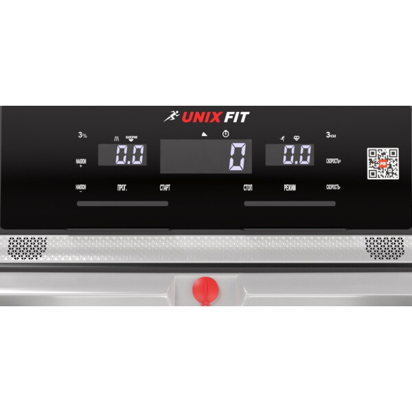 Устройство обладает интуитивно понятной консолью на русском языке. Панель управления отображает такие параметры как скорость, пройденная дистанция, потраченные калории, время тренировки, пульс и угол наклона. На поручнях расположены датчики пульса, которые помогут отследить сердечный ритм во время тренировки и кнопки изменения скорости и угла наклона.
