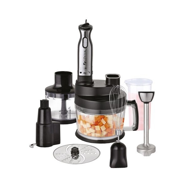 Блендер Centek CT-1310 способен выполнять множество функций. Помимо ножа-измельчителя, в комплект входит венчик для взбивания, насадка для замешивания теста, нарезки кубиками и шинковки. К устройству прилагается чаша для измельчения объемом 500 мл и толкатель. Для подключения к сети используется 1.5-метровый шнур.