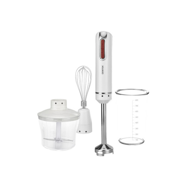 Блендер Centek CT-1339 очень удобен в использовании, нож из нержавеющей стали прослужит вам долгое время. В комплекте с блендером есть венчик для взбивания (поможет приготовить блинчики, муссы, безе и многое другое), также есть специальный удобный стакан, в котором можно взбивать или смешивать продукты. Кроме того в комплекте есть измельчитель объемом, который быстро и качественно порубит зелень, поможет сделать соус и многое другое.