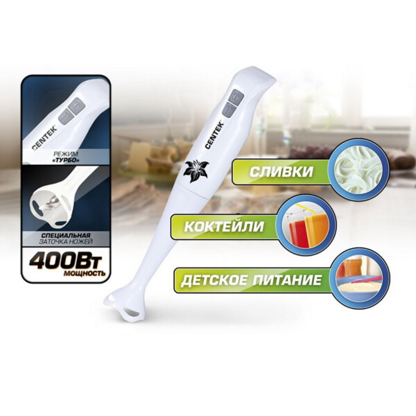 Блендер Centek CT-1341 White - компактный прибор, позволяющий быстро измельчать и смешивать продукты, взбивать кремы и муссы, готовить смеси для детского питания и многое другое.
