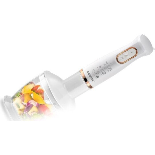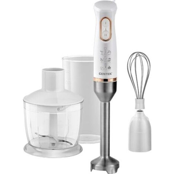Блендер Centek CT-1347 действует на двух рабочих скоростях и обладает мощностью 800 Вт. Металлическая погружная часть обеспечивает длительный срок службы такого устройства. Блендер Centek CT-1347 укомплектован 600-миллилитровым измельчителем и 600-миллилитровым стаканом. В комплекте с устройством также есть венчик, поэтому вы быстро и с комфортом сможете готовить тесто.