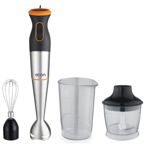 Представляем Вам простой, но надежный погружной блендер ECO-443HB мощностью 1000 Вт. В качестве доступных функций доступны два варианта скорости, а так же импульсный режим. Ножи и насадка сделаны из нержавеющей стали. В комплекте с блендером Вы так же найдете мини-измельчитель объемом 500 мл, и мерный стаканчик объемом 500 мл. Отличный помощник на кухне!