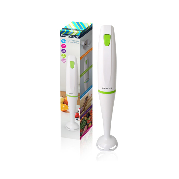 Ручной блендер с 1 насадкой. Пластиковый корпус. Нож из нержавеющей стали. 1 скорость работы. Тихая работа благодаря DC мотору. Петля для подвеса.