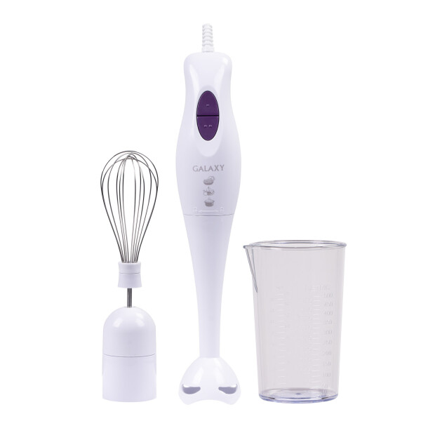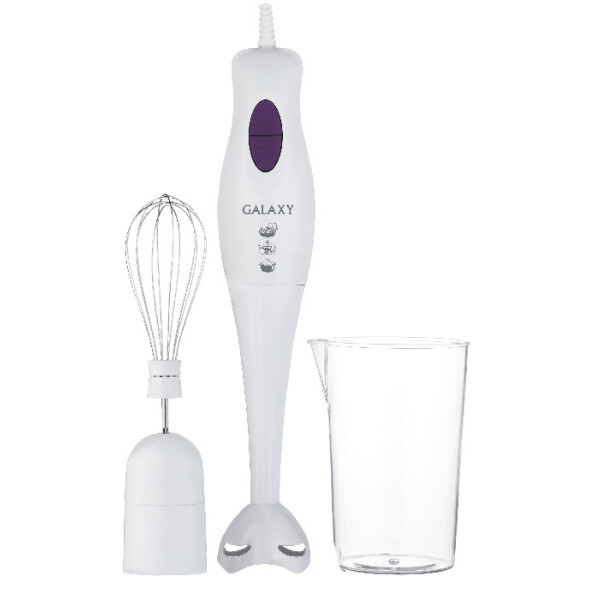 Блендер Galaxy GL 2123 погружного типа представлен в эргономичном удобном для удержания дизайне и имеет бело-фиолетовую расцветку. Корпус и погружная часть устройства производятся из легкого и предельно простого в уходе пластика. Модель Galaxy GL 2123 работает на двух скоростях при максимальной мощности 300 Вт. Предусматривается наличие венчика для взбивания и мерного стакана.
