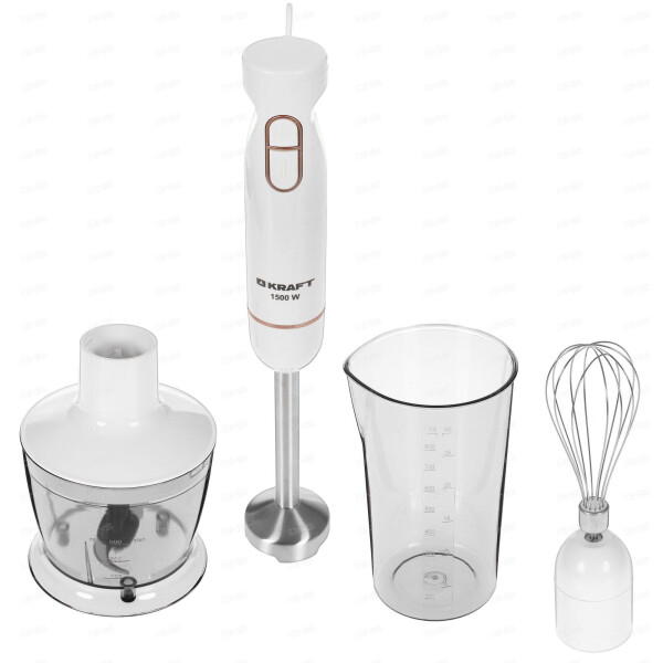 Блендер Kraft KF-HB1542WGLR поможет сэкономить время на приготовление различных блюд, так как с его помощью вы сможете быстро измельчать, смешивать и взбивать в однородную массу различные продукты. Он оборудован насадкой-блендером, измельчителем с чашей 500 мл, венчиком для взбивания и мерным стаканом. Погружная часть и лезвия из нержавеющей стали сохраняют свои свойства на протяжении длительной эксплуатации. Рукоятка эргономичной формы гарантирует комфортное удержание прибора. Для повышения безопасности в Kraft KF-HB1542WGLR реализована технология защиты от перегрева.