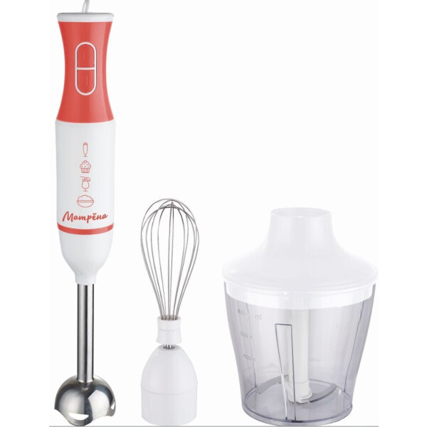 2 скорости работы. Ножи из нержавеющей стали. Металлическая насадка блендер. Мощность 350Вт. Измельчитель 500 мл. Стакан для смешивания 800 мл. Венчик.