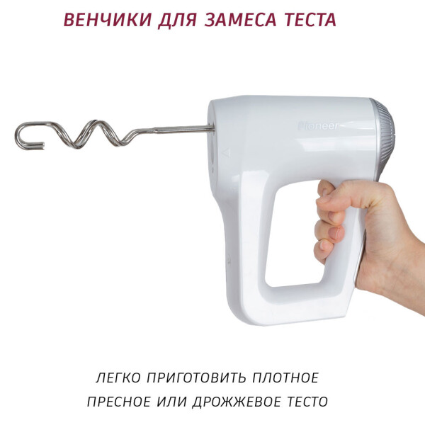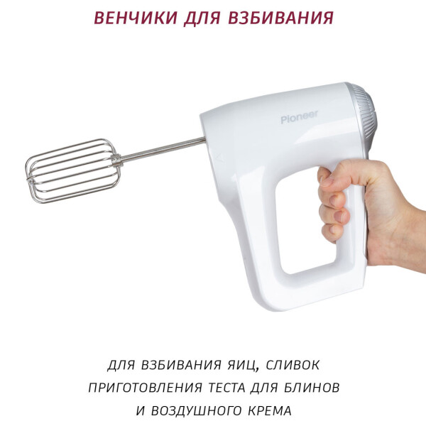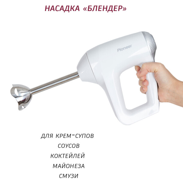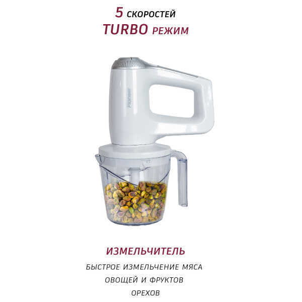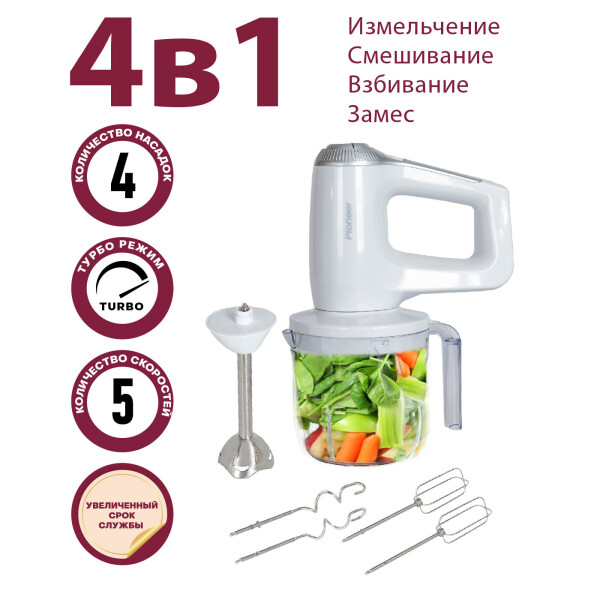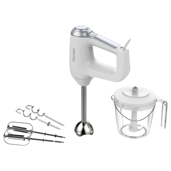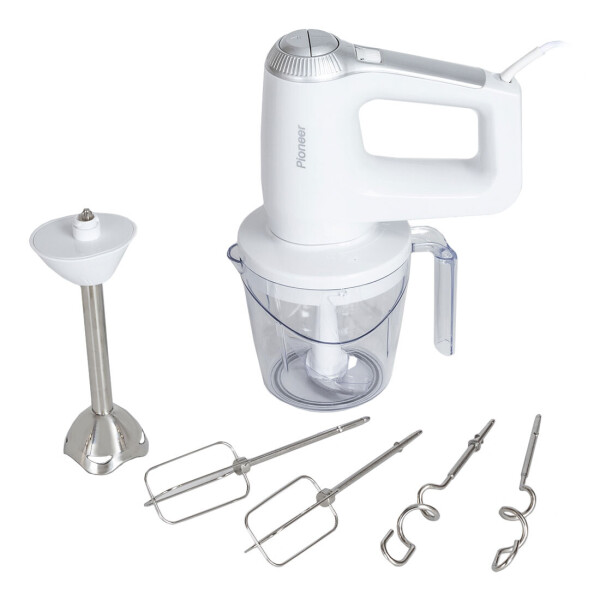 Многофункциональный блендер-миксер 4 в 1 Pioneer HB125S укомплектован измельчителем, 2 венчиками и 2 крюками для теста. Пластиковый корпус выполнен в бело-сером цвете. 5 скоростей и турборежим позволяют подобрать оптимальный режим для смешивания продуктов.