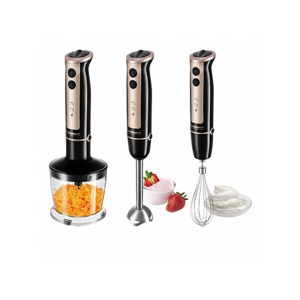 Блендер REDMOND RHB-2948 многофункциональный кухонный прибор 3 в 1 с комплектом насадок, который позволит быстро измельчить, смешать и взбить практически любые продукты. При помощи одного устройства, просто меняя насадки, вы сделаете смузи и крем-супы, приготовите бисквитное тесто и кремы для десертов, нарежете ингредиенты для салатов, горячих блюд. Регулятор на рукоятке устройства обеспечивает простое и удобное переключение скоростного режима: с его помощью вы, не прерывая рабочий процесс, можете изменить скорость вращения насадок в пределах от 9 000 до 15 000 об/мин. Режим Турбо - Завершая приготовление блюда или напитка, включите турборежим нажатием кнопки TURBO. Количество оборотов насадок увеличится до 16 000 об/мин, что позволит довести смузи, коктейль, мусс или крем-суп до однородной консистенции без единого комочка.Чтобы RHB-2948 служил долго даже при частом использовании и не вышел из строя из-за поломки двигателя, в модели реализована двойная система защиты.