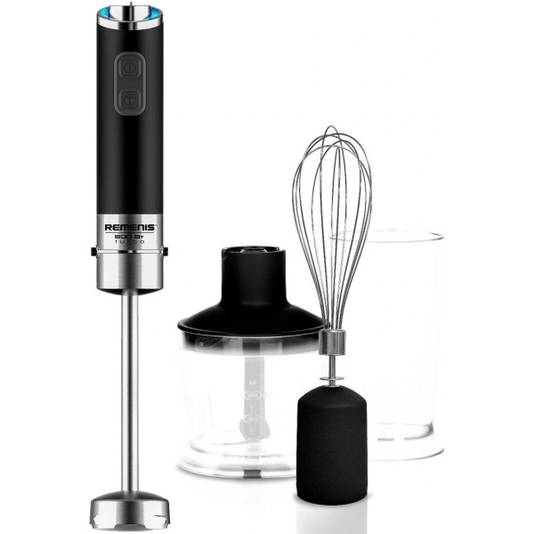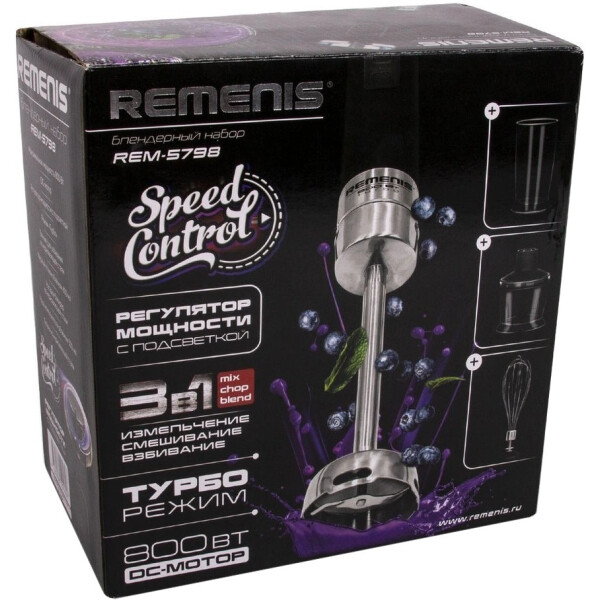 Блендер Remenis REM-5798 комплектуется мерным стаканом, который незаменим для точного соблюдения пропорций того или иного рецепта. Для удобства в процессе измельчения или взбивания ингредиентов устройство дополнено 0.5-литровой чашей. Для плавной регулировки 21 скоростного режима достаточно воспользоваться переключателем в верхней части корпуса.