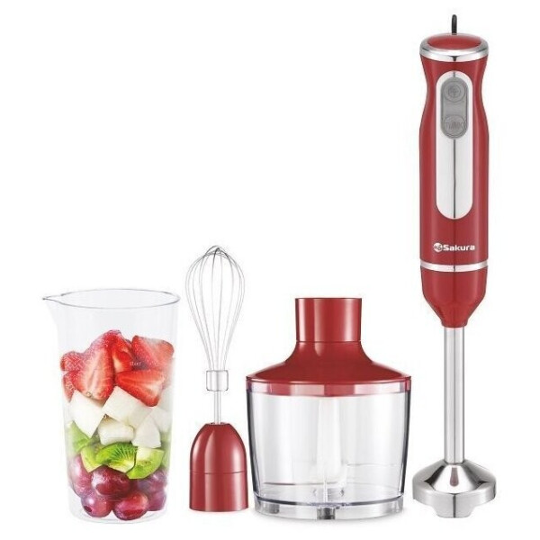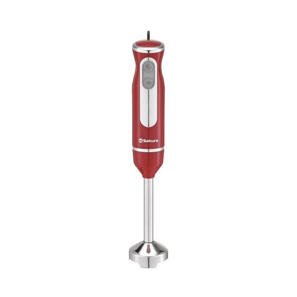 Погружной блендер Sakura SA-6247SR оптимален для эксплуатации в бытовых условиях. Двигатель мощностью 600 Вт способствует высокой скорости вращения насадок. Элемент с острыми ножами предназначен для однородного измельчения овощных и фруктовых смузи, паштета, детского питания, супа-пюре и соуса. С помощью венчика взбивают в пышную массу крем для торта, яичные белки, молочный коктейль. Насадки прочно фиксируются на держателе, что способствует безопасной эксплуатации.