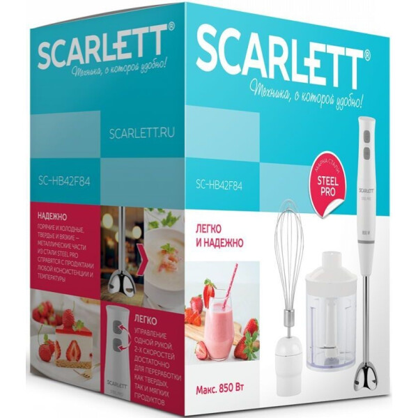 Блендер Scarlett SC-HB42F84 способен заменить сразу несколько кухонных приборов. Сливки, яичные белки взобьёт венчик, он же поможет в замешивании лёгкого теста, например, для блинчиков. Измельчитель (500 мл) быстро подготовит овощную поджарку для супа, мясо для запеканки или порубит орехи. Погружная насадка сделает пюре, такое однородное и нежное, что его можно будет использовать даже для детского питания.