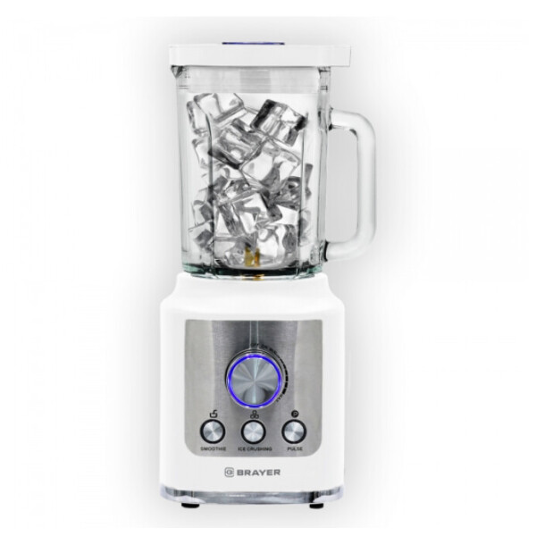 Блендер стационарный Brayer BR1200WH белого цвета с серебристыми вставками имеет стильный дизайн и хорошие характеристики производительности.