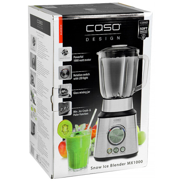 Блендер CASO MX 1000 мощностью 1000 Вт с плавной регулировкой скорости, идеально подойдет для быстрого приготовления коктейлей, смузи, соков и соусов. Блендер имеет автоматические программы приготовления: смузи, коктейлей, фраппе, алкогольных напитков и так далее, а двигатель обеспечивает хорошую скорость вращения от 9500 до 17000 об/мин для инновационного ножа с 8 лезвиями, изготовленного из высококачественной нержавеющей стали. Ручная регулировка скорости ведется с использованием светодиодной подсветки.