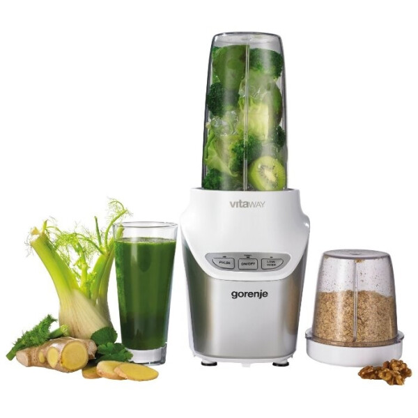 Блендер Gorenje BN1000W стационарная модель сшестилопасным ножом Nutri Power иизмельчителем для сухих продуктов. Также вкомплекте большая ималая емкости, крышки для хранения идорожная сотверстием для питья, которая позволяет взять чашу ссобой. Прибор подходит для приготовления пюре, смузи, измельчения орехов, трав, овощей ифруктов.