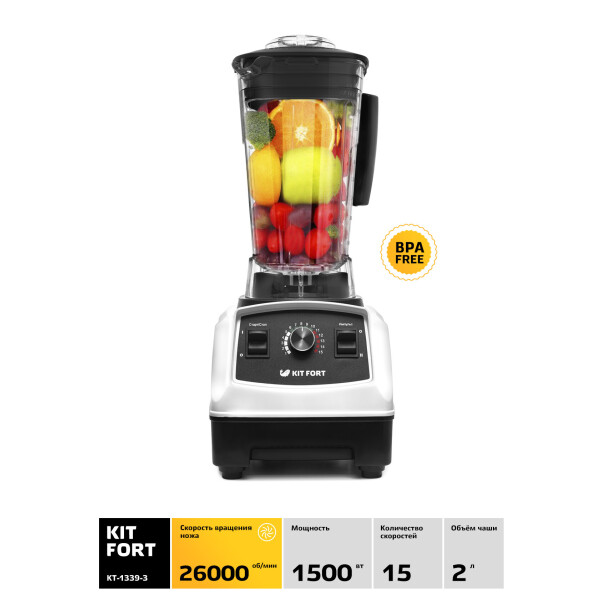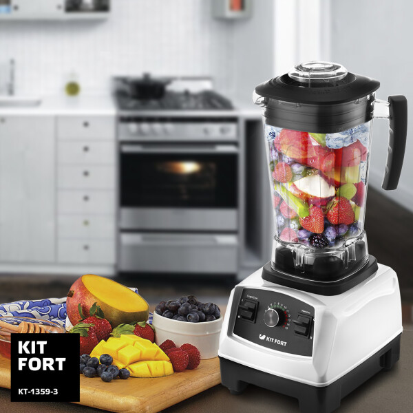 Kitfort КТ-1359 – стационарный блендер с двухлитровой чашей. Он быстро измельчает, смешивает и взбивает ингредиенты. Эта модель позволяет готовить детское и спортивное питание, соусы, молочные коктейли и смузи, а также фитнес-напитки.