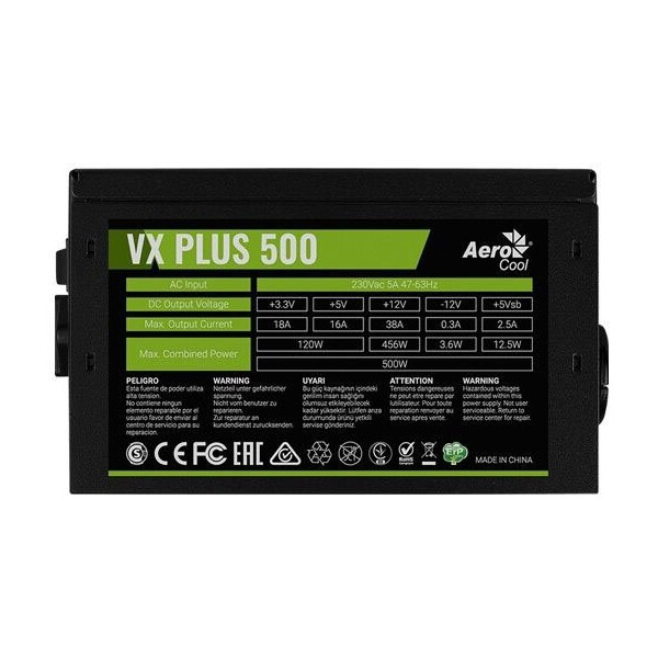 Блок питания AEROCOOL VX PLUS 500W подойдет для игровой сборки с одной видеокартой. Основная линия питания процессора приближена к максимальной мощности блока (456 Вт из 500 максимальных). Мощности модели достаточно для питания неплохого софта. Вентилятор работает уверенно, без перегреваний и лишнего шума за счет качественной системы охлаждения.