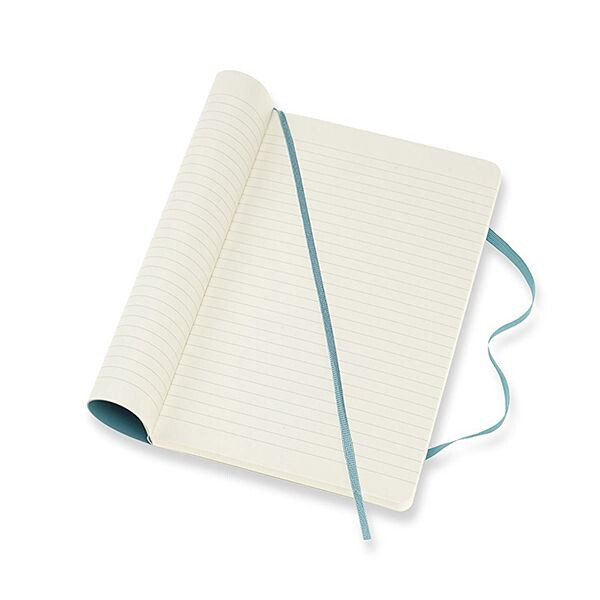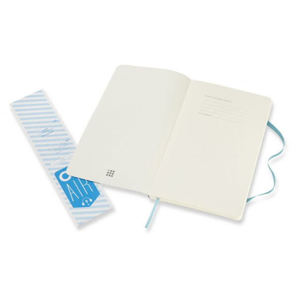 Эта записная книжка среднего размера имеет классический дизайн Moleskine: мягкая обложка голубого цвета с закругленными углами, эластичная резинка, не дающая блокноту раскрываться в сумке, мягкая закладка, внутренний кармашек для визиток и ценных клочков бумаги. Не желтеющая, быстро впитывающая чернила бумага.