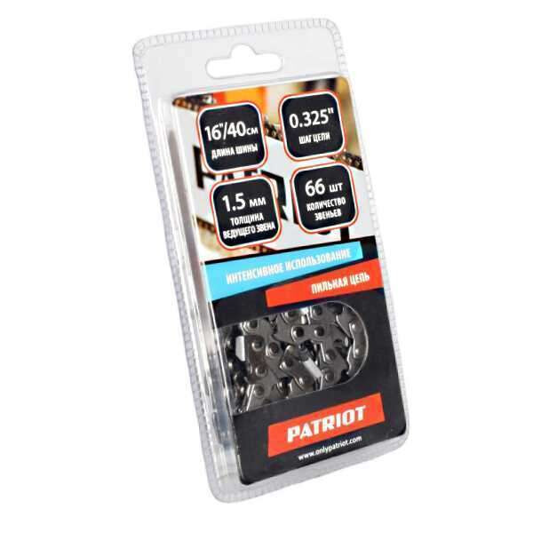 Цепь бензопилы Patriot 21BP-66E, арт. 862321566 для шины 16 дюймов с шагом цепи 0,325 дюйма и шириной паза 1,5 мм. Цепь состоит из 66 звеньев. Цепь подходит для бензопил HomeGarden HG 457, HG 426 ZIP и пил других производителей со схожими характеристиками.