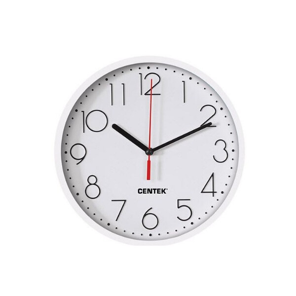 Модель Centek CT-7105 White привлекает внимание благодаря крупным цифрам, хорошо различаемым издалека. Дополнительных функций в виде будильника не имеется. Питание осуществляется от одной AA-батарейки. Часы с диаметром 23 см обладают пластиковым корпусом и надежным кварцевым механизмом.