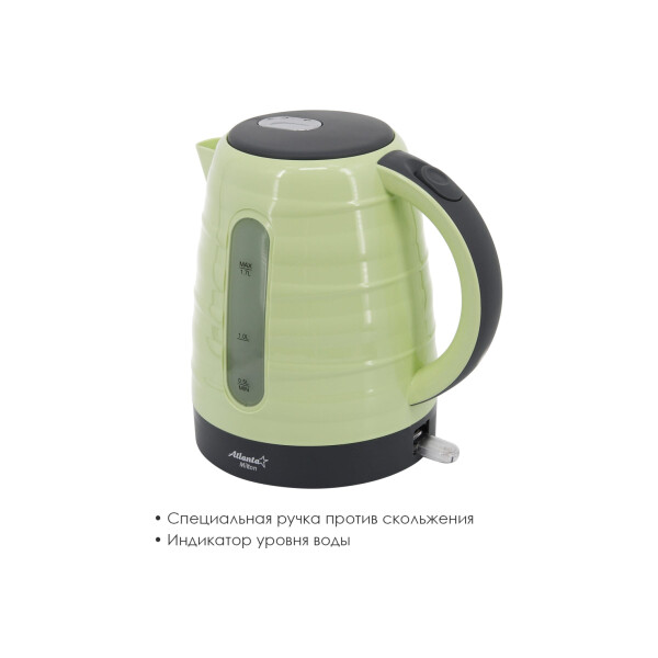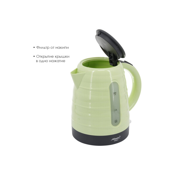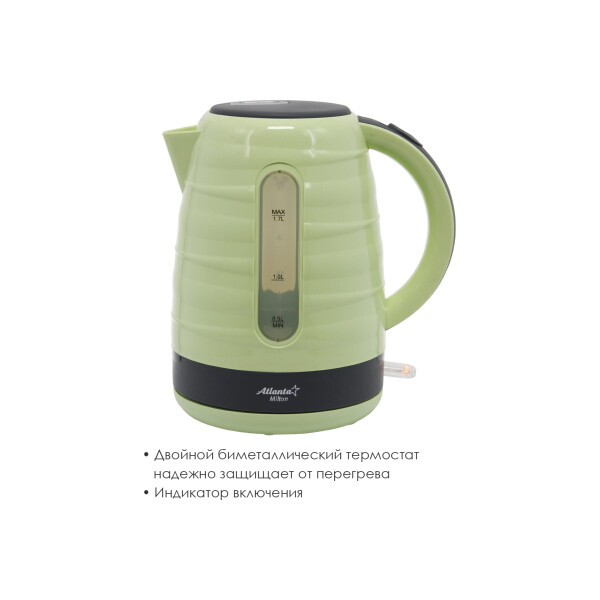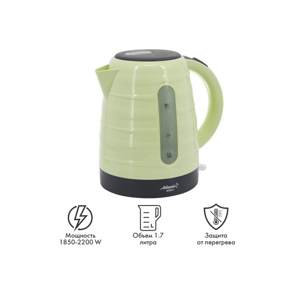 Электрический чайник ATLANTA ATH-2375 (green) прост в управлении и долговечен в использовании. Изготовлен из высококачественных материалов. Мощность 2200 Вт позволит вскипятить 1.7 литра воды в считанные минуты. Для обеспечения безопасности при повседневном использовании предусмотрены функция автоматического выключения, а также защита от включения при отсутствии воды.