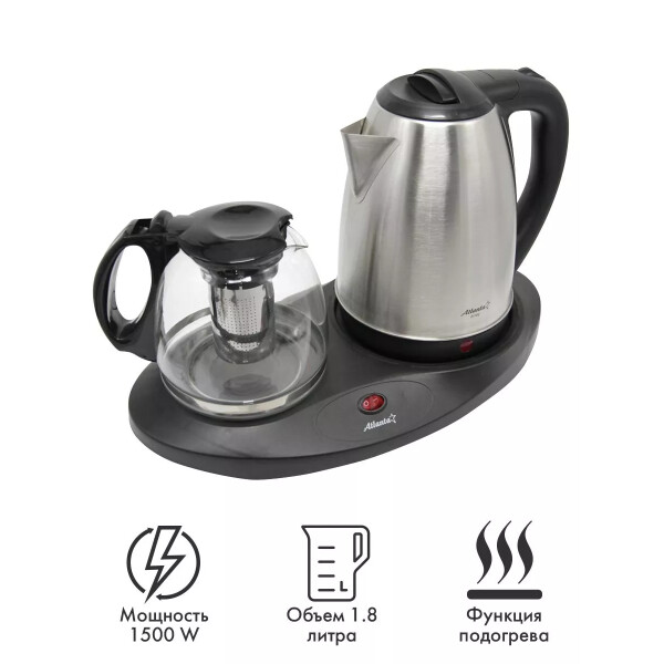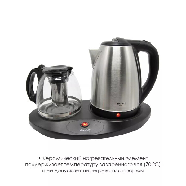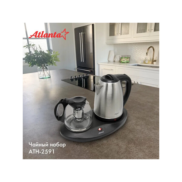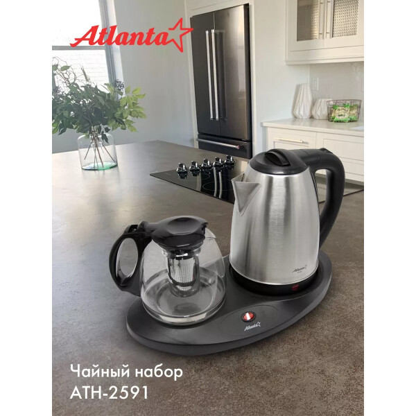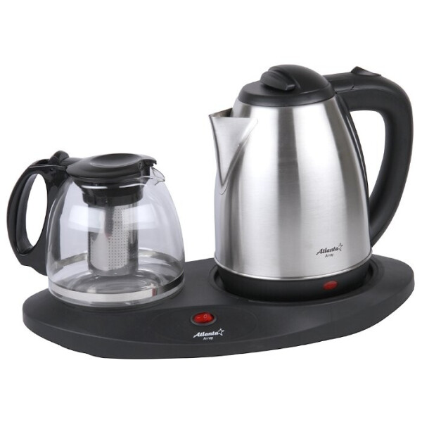 Atlanta ATH-2591 - чайный набор, в состав которого входят подставка с подогревом и два чайника, заварочный и электрический, для кипячения воды.