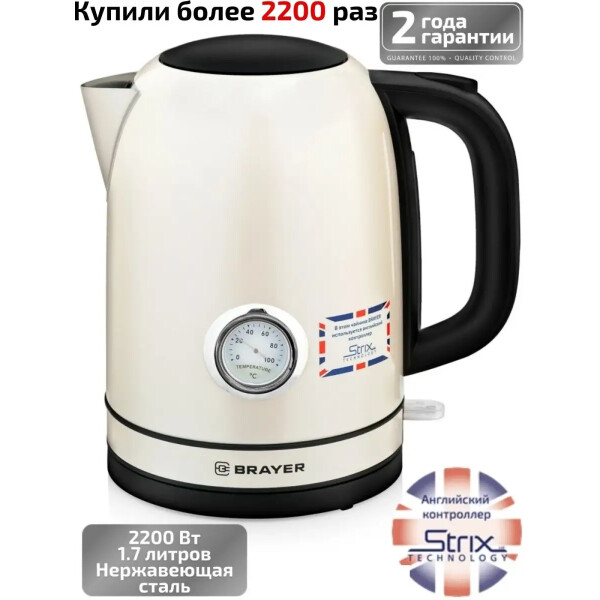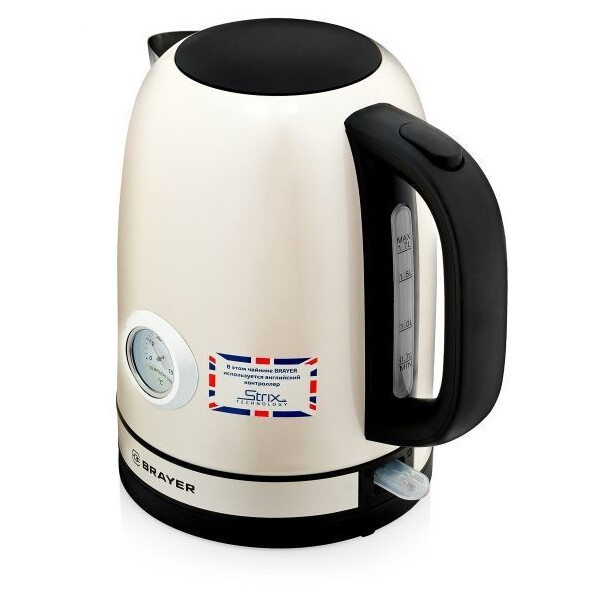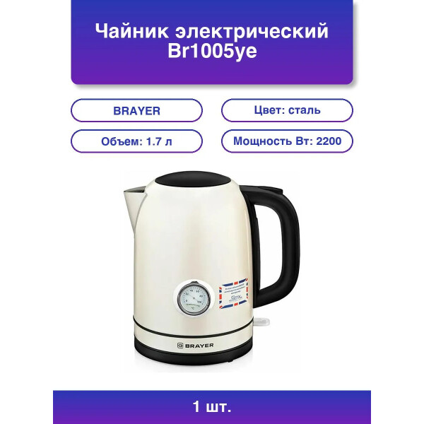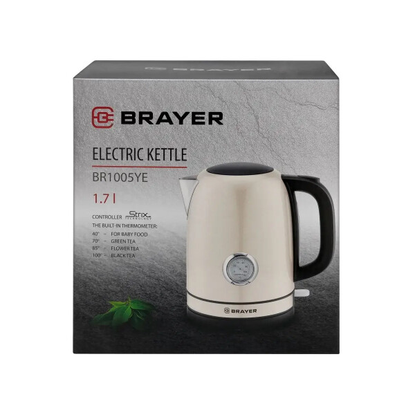 Чайник электрический Brayer BR1005YE органично впишется в интерьер любой кухни. Обладая мощностью 2200 Вт и объемом 1.7 л., он закипает в течение нескольких минут, что позволяет использовать его в большой семье или при проведении кофе-пауз в офисе. Корпус изготовлен из высококачественной нержавеющей стали. Она не содержит в своем составе вредных или опасных для здоровья компонентов, не вступает в реакции с химически агрессивными веществами и соединениями, которые могут присутствовать в воде. Съемный фильтр препятствует попаданию в чашку хлопьев накипи и других твердых частиц, которые могут оказаться в жидкости. Дополнительным удобством использования изделия является наличие индикаторов уровня воды и включения. Чайник установлен на удобной вращающейся платформе.