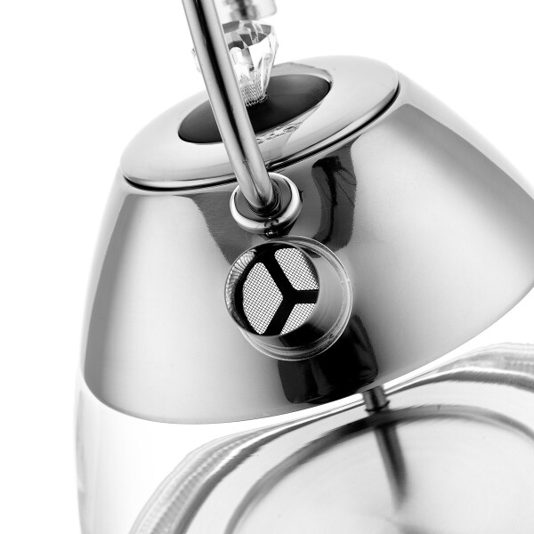 Объём чайника составляет 1,7 л и имеет внутреннюю подсветку. При отсутствии воды и при закипании чайник отключится самостоятельно, обеспечивая безопасность.