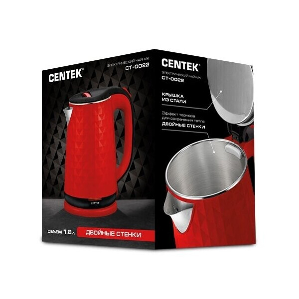 Электрочайник Centek CT-0022 станет любимым устройством для тех, кто предпочитает приобретать качественные и удобные в использовании приборы. Красный корпус предполагает наличие удобной крышки и ручки, обеспечивающую надежный хват. Объема чайника 1,8 л будет достаточно, чтобы вы смогли сделать более 5 чашек чая: вам не придется кипятить вторую порцию воды.