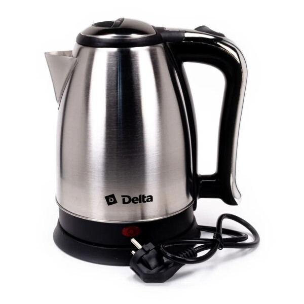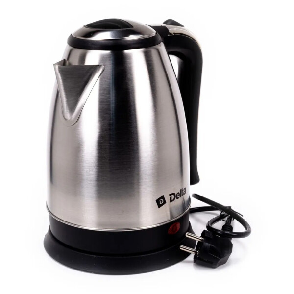 Электрочайник Delta DL-1213/M представлен в классическом серебристо-черном дизайне. Прибор имеет прочный металлический корпус, дополненный элементами из жаропрочного пластика. Этот материал устойчив к высоким температурам, не плавится и не источает неприятных запахов или вредных компонентов. Чайник вмещает 1.8 л и действует при мощности 1500 Вт.
