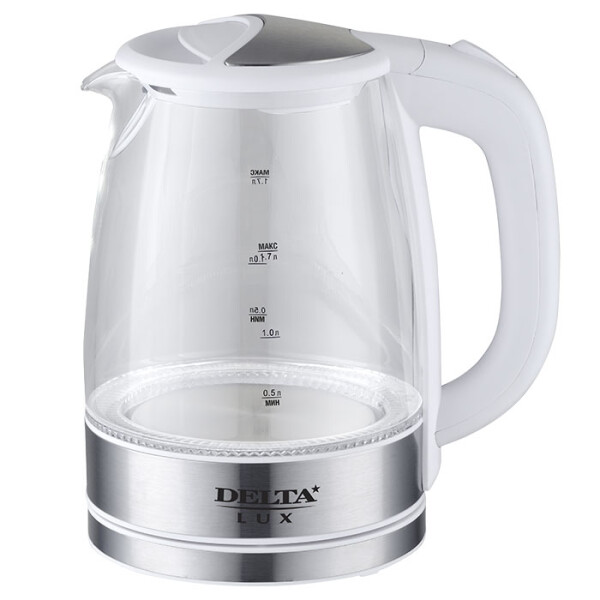 Электрочайник Delta LUX DL-1204W выполнен из жаропрочного стекла, устойчивого к воздействию высоких температур. Высокая мощность закрытого нагревательного элемента 2200 Ватт позволит быстро вскипятить воду. Кнопка включения на ручке и отсек для хранения шнура обеспечивают удобство использования.
