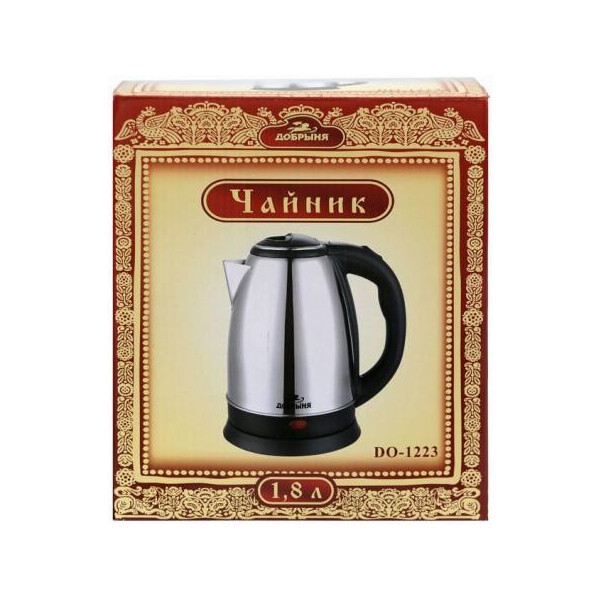Металлический корпус, скрытый нагревательный элемент, отличная вместительность – это основные достоинства, которые характерны для электрического чайника Добрыня DO-1223. О том, что чайник работает, вам подскажет специальный индикатор, который загорается при включении устройства. Чайник Добрыня дополняется удобной подставкой, которая не требует определенного положения техники.
