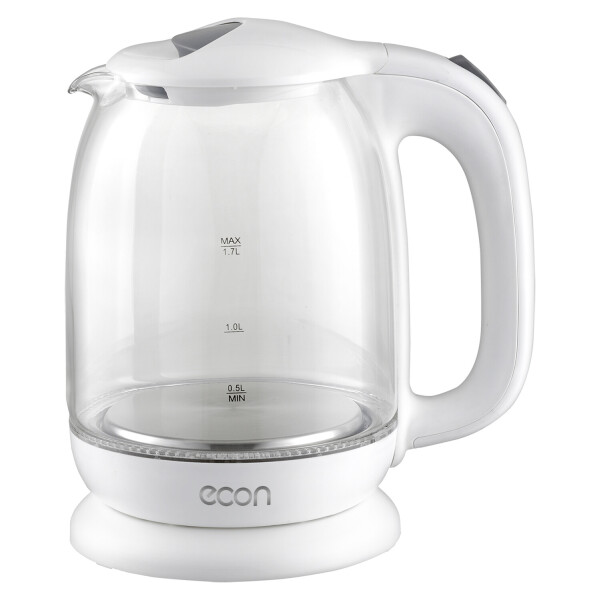Этот электрический чайник от компании Econ быстро нагреет воду и сам отключится после закипания. Его емкость составляет 1,7 литра, а мощность 2200 Ватт, в качестве нагревательного элемента выступает металлический диск расположенный на дне чайника. Крышка открывается вручную, чайник вращается на 360 градусов относительно подставки. Есть индикация включения чайника и уровня воды с подсветкой, шнур убирается в подставку, также стоит защита от включения при отсутствии воды. Внутри чайника установлен фильтр для исключения попадания накипи в кружку.